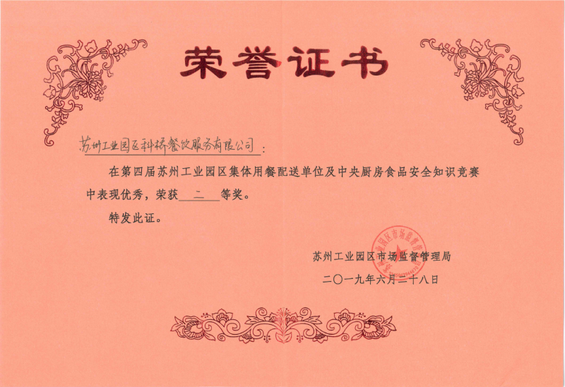 科橋餐飲參加蘇州工業園區集體用餐配送單位及中央廚房食品安全知識競賽喜獲獎項