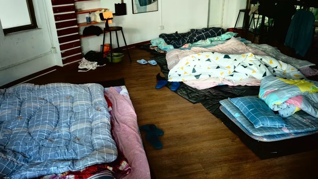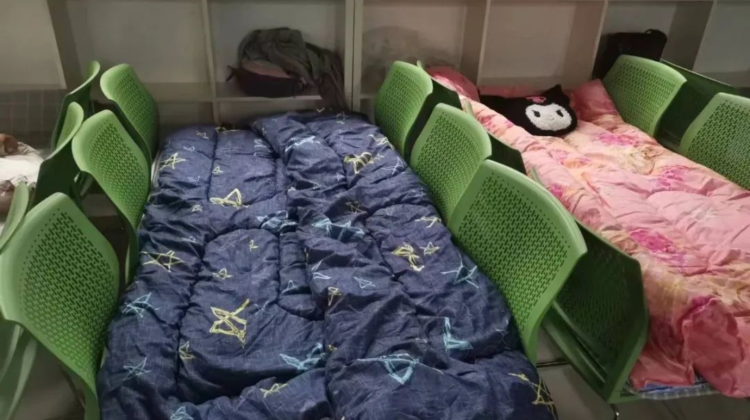 封控在校內,員工們的住宿成了難題,辦公室、大廳、雜貨間……這些都是員工們晚上搭建床鋪的地方。椅子拼接、紙板墊在地上……“小床鋪”是員工唯一可以放松休息的地方。條件艱苦,他們依舊樂觀面對,用心做好餐飲保障。