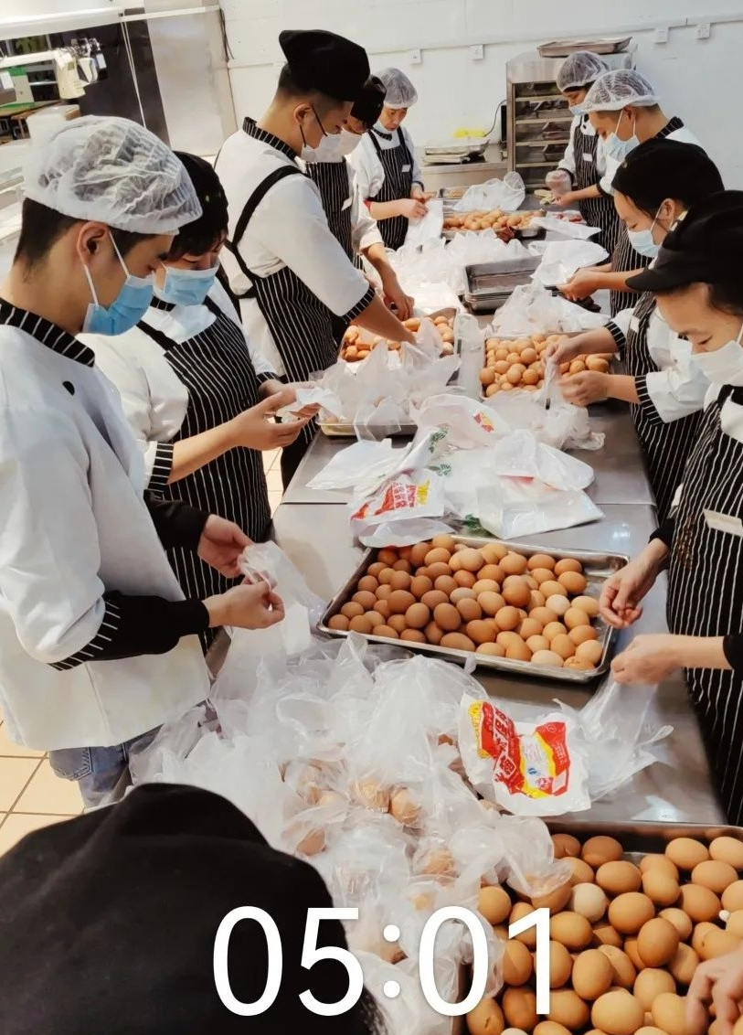 “疫”日三餐,新團隊人手嚴重不足,每個人都是身兼數職,超負荷運作。食材供應商送貨不能下車,所有物資均有食堂工作人員進行搬運,在滿負荷工作量基礎上真是雪上加霜。項目經理凌晨一點多接駁卸貨、面點師從凌晨工作到晚上開餐結束、新進大學生的刀工也不比廚工阿姨差……每個人都在自己的崗位上默默堅守,將使命放在心頭,將責任扛在肩上,他們必將打贏這場防疫保衛戰。