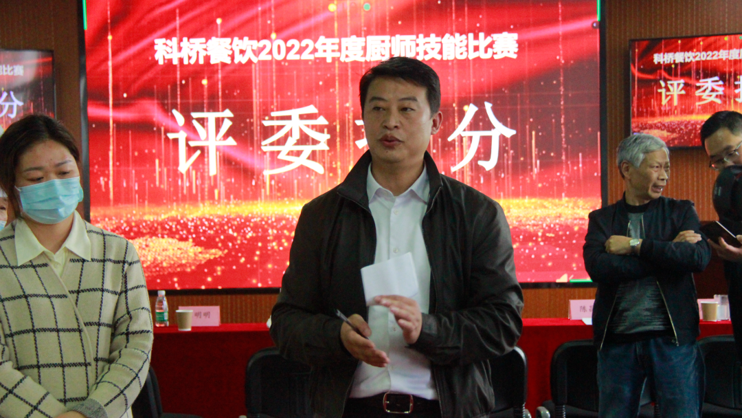 競賽伊始,公司常務副總經理陳昌靜做動員講話。他指出科橋團餐人的高質量發展是從公司管理層對菜品的高度重視,到各項目經理和大廚們,把每一道菜品當做自己的事業,完美呈現出菜品的美感和靈魂。提高顧客滿意度,是我們的核心競爭力。