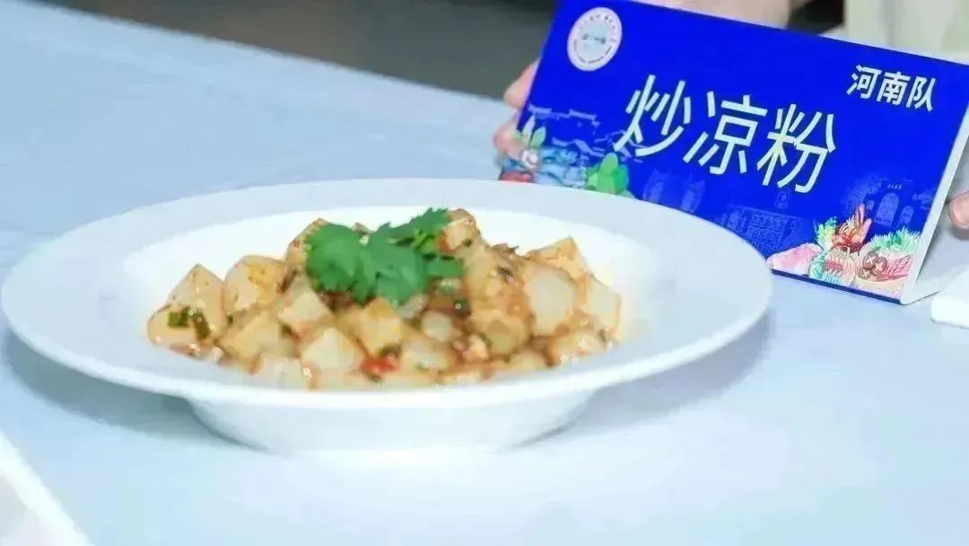 河南傳統(tǒng)小吃炒涼粉色澤透明,晶瑩剔透,嫩滑爽口。有詩(shī)曰:“冰鎮(zhèn)刮條漏魚(yú)穿,晶瑩沁齒有余寒。味調(diào)濃淡隨君意,只管涼來(lái)不管酸。”
