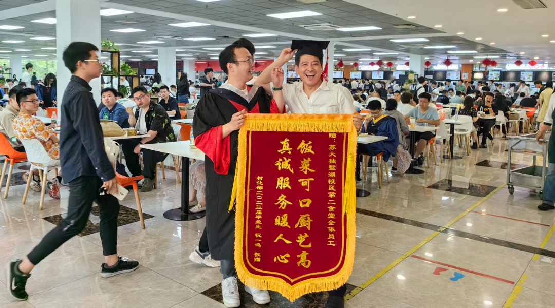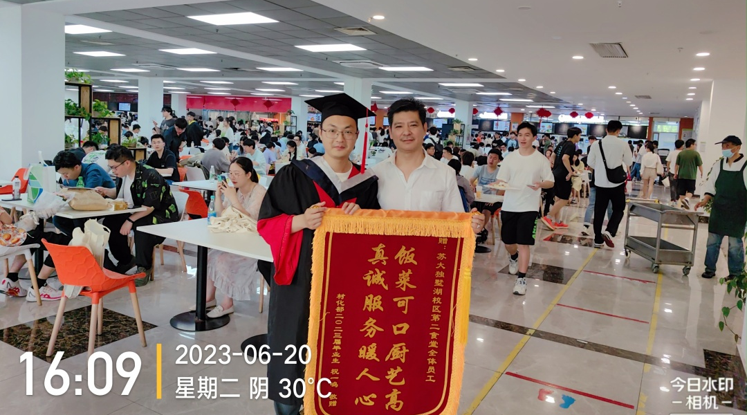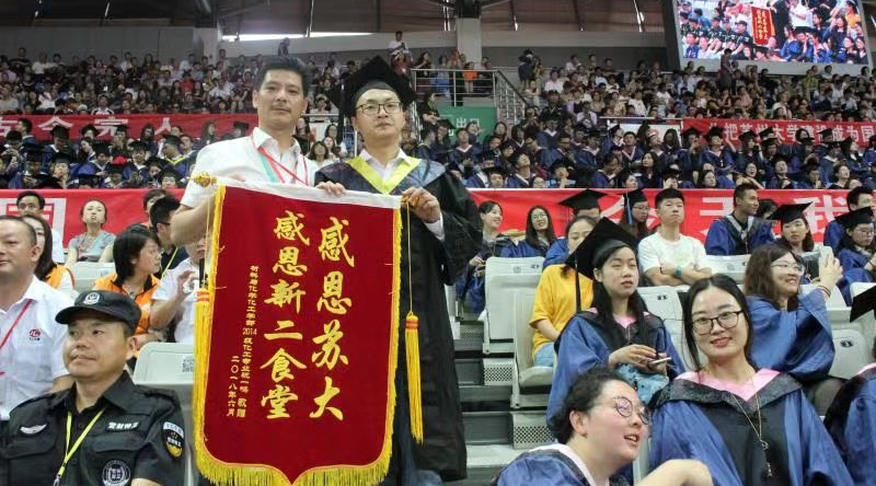 初入校園大門的祝同學為了緩解經濟壓力,成為了獨墅湖二食堂一名勤工儉學的學生。在之后的接觸中,徐經理發現小伙子勤奮好學,又無意間了解到他家庭比較困難,便將情況向公司匯報,商議之后決定為他免費提供一日三餐,解決他在求學路上的后顧之憂。從本科入學到博士畢業,這一幫就是九年。