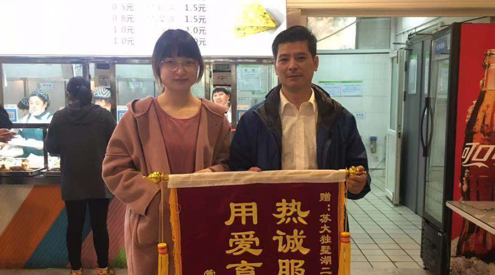 多年來,徐經理幫助了很多蘇大學子,孩子們看在眼里,也記在心里,送上一面滿載心意的錦旗。榜樣的力量是無窮的,獨二食堂的同事們知道情況后也紛紛獻出愛心,在行動上幫助困難學子。